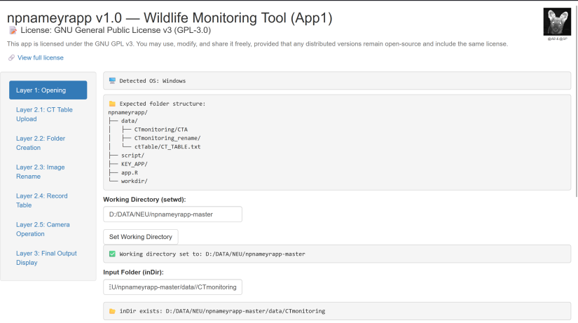 Pemantauan satwa liar menggunakan camera trap menghasilkan data yang sangat kaya, namun sering kali menantang untuk diolah secara konsisten, mudah, dan cepat. Aplikasi npnameyrapp dikembangkan oleh Prof. Dr. Satyawan Pudyatmoko, S.Hut., M.Agr.Sc. selaku dosen Fakultas Kehutanan (FKT) UGM bersama Arief Budiman, peneliti Laboratorium Pengelolaan Satwa Liar FKT UGM. Aplikasi ini hadir sebagai solusi untuk menjembatani proses pengumpulan data di lapangan dengan analisis ekologi yang terstandar. Dalam penggunaan aplikasi ini, pengguna memerlukan R versi 4.3 atau lebih baru dan R Package berupa camtrapR, overlap, RPresence, shiny, magick, serta dependensi terkait [Download via GitHub  repository:  https://github.com/ariefalpinus/npnameyrapp/tree/master ]